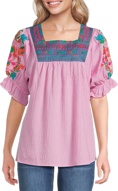 Calessa Embroidered Square Neck Short Sleeve Tunic, Womens, S, Pink Multi